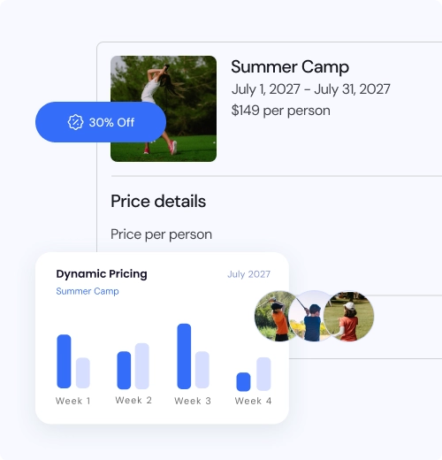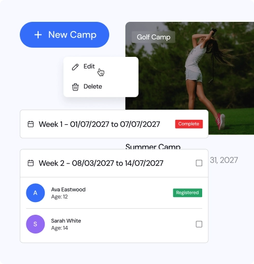 • Centralise golf camp setup, weekly schedules, capacity, and registration rules in one platform